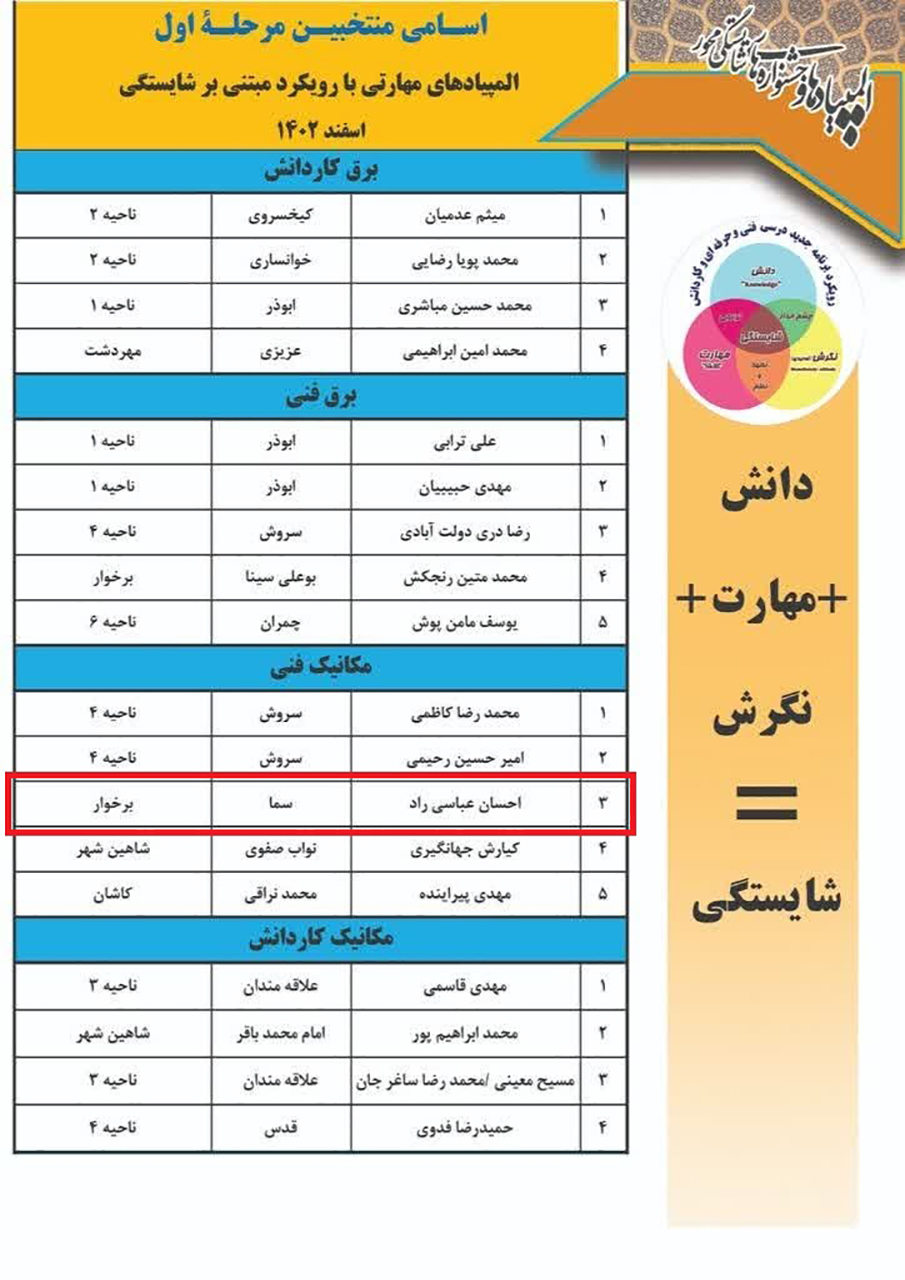 فضای رقابتی سالمی که در بین جوانان برای به نمایش در آوردن سطح مهاتهای خود ایجاد میگردد، باعث افزایش انگیزه آنان میشود. در واقع این اولین گام در ایجاد تیم ملی مهارت است. همچنین این داوطلبان میتوانند با شرکت در آزمونهای فنی و حرفهای کارت مهارت فنی و حرفهای را دریافت نمایند.